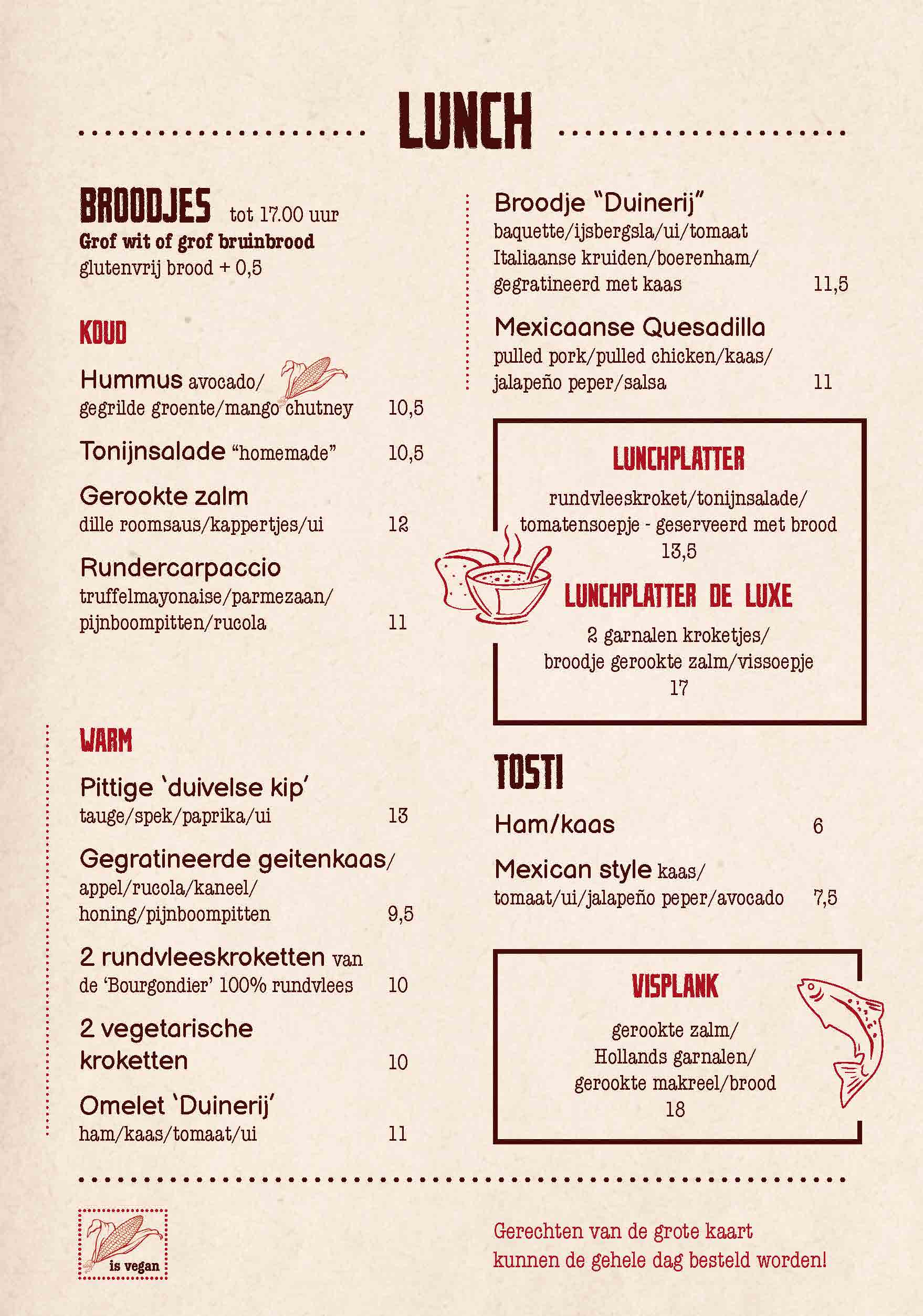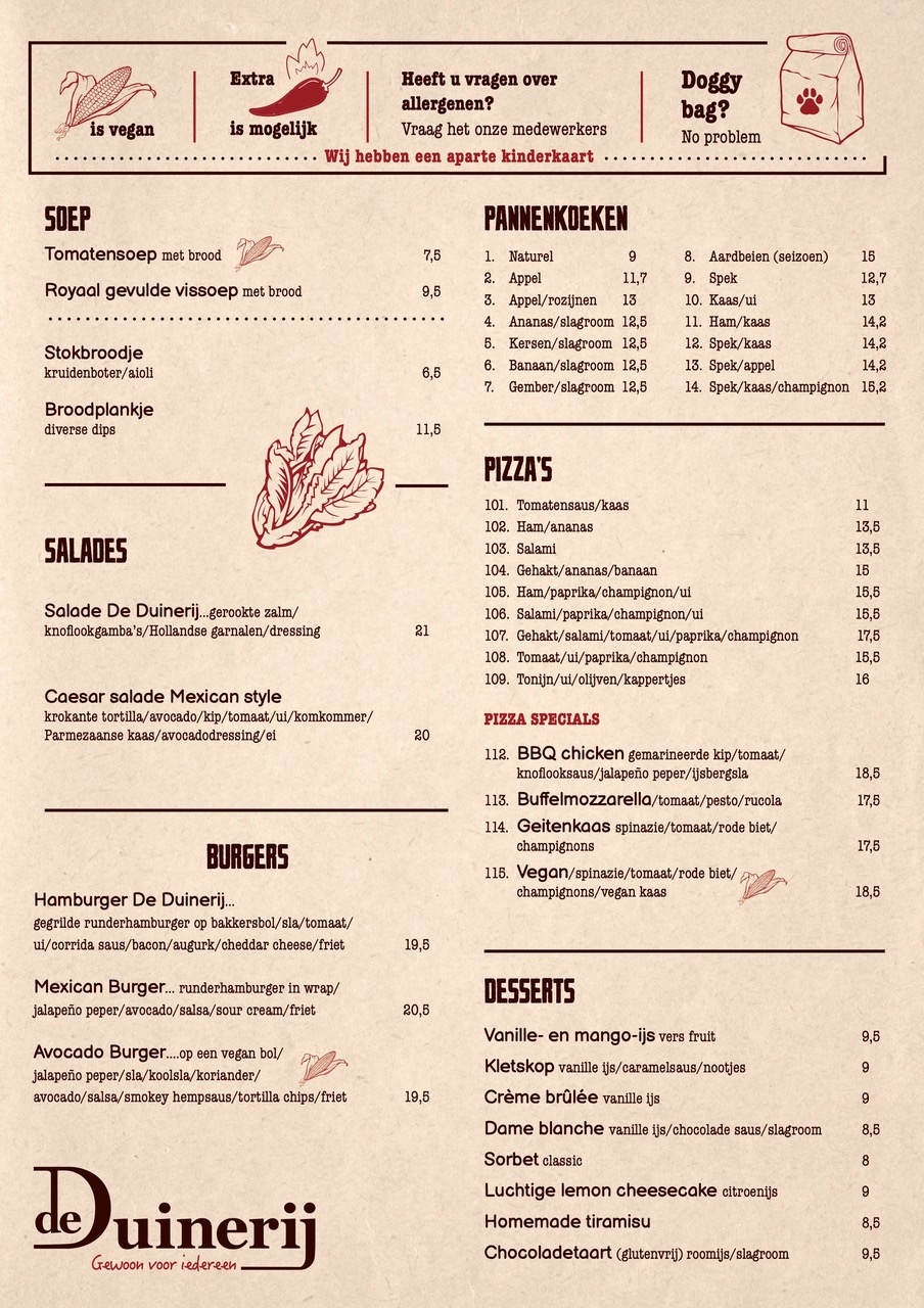 Ons restaurant “De Duinerij” staat bovenaan het strand op de boulevard in Bergen aan Zee. De Duinerij is een fijne, gezellige ontmoetingsplek voor iedereen. De kleurrijk ingerichte zaak heeft een lichte serre en een ruim terras met uitzicht op de duinen en de zee. Met een gevarieerde menukaart van vis/vlees/salades en Mexicaanse specialiteiten proberen wij een zo breed mogelijk publiek te voorzien van eerlijke gerechten. Zo bakken wij ook, naar grootmoeders recept, heerlijke pannenkoeken en serveren we huisgemaakte pizza′s. Voor de kinderen is er een aparte kinderkaart. Honden zijn “mits aangelijnd” van harte welkom.